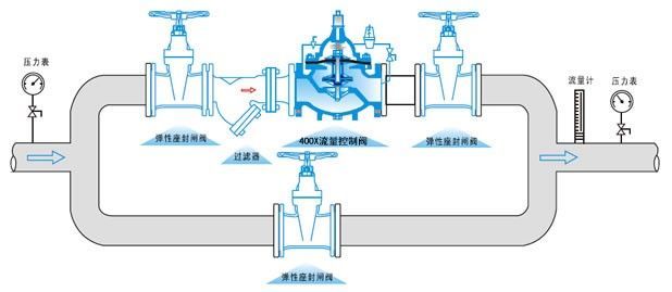400X-16-200流量控制閥,由主閥、流量調(diào)節(jié)閥、針閥、導閥、球閥、微形過濾器和壓力表組成水力控制接管系統(tǒng)。利用水力自動操作,控制和調(diào)節(jié)主閥開度,使通過主閥的流量保持不變。本產(chǎn)品利用水力自力控制,不需要其它裝置和能源,保養(yǎng)簡便,流量控制穩(wěn)定。廣泛用于高層建筑、生活區(qū)等供水管網(wǎng)系統(tǒng)及城市供水工程。 400X-16-200流量控制閥--工作原理 當閥門從進口端給水時,水流過針閥進入主閥控制室,并經(jīng)過導閥、球閥流出主閥控制室到出口,此時主閥處于全開或浮動狀態(tài)。調(diào)定主閥上部的流量調(diào)節(jié)閥,可為主閥設定一定開度。調(diào)節(jié)針閥開度和調(diào)節(jié)導閥彈簧壓力,即可使主閥開度保持在設定開度,并在壓力變化時導閥進行自動調(diào)節(jié),保持流量不變。 400X-16-200流量控制閥--主要配件: | 零件名稱 | 零件材料 | | 閥體 閥蓋 | WCB | | 閥座 閥盤 | 銅合金 | | 密封圈 O型圈 | 丁腈橡膠 | | 閥桿 | 2Cr13 | | 彈簧 | 50CrVA | | 針型閥 | 銅合金 | | 球閥 | 銅合金 | | 浮球閥 | 銅合金 | | 微型過濾器 | 不銹鋼 |