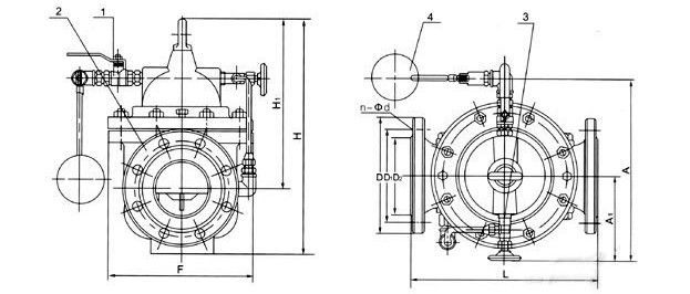 遙控浮球閥100X型--解剖圖: 1、球閥2、產(chǎn)閥3、針閥4、浮球閥