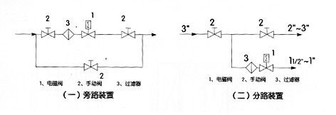 煤氣電磁閥--安裝須知 1、安裝時電磁閥線圈向上,并保持垂直位置,電磁閥上箭頭或標記應與管道流向一致,不得安裝在有濺水或漏水的地方。 2、電磁閥的工作介質應清潔無顆粒雜質,電磁閥內件表面上的污物及過濾器,需定期清潔干凈。 3、在電磁閥發(fā)生故障時,為了及時隔離電磁閥,并保證系統(tǒng)正常運行,最好安裝旁路裝置(如圖一)。 4、在管路系統(tǒng)中,安裝在支路上的電磁閥通徑應小于主管道閥門的通徑(如圖二)。 5、安裝電磁閥前,管道必須清洗干凈。建議在閥前安裝過濾器,蒸汽管道安裝疏水閥。 6、不能將閥安裝在管道的低凹處,以免因蒸汽冷凝水、雜質等沉淀在閥內而防礙動作。 7、普通型不能在爆炸危險場合使用。 8、在管路剛性不足情況下,建議把閥前管道用支架固定,以免電磁閥工作時引起振動。 9、在安裝前,要注意看清產品標牌,認真閱讀使用說明書,判斷產品是否符合使用條件。 10、電磁閥前后管道上需安裝壓力表,以便觀察管道壓力。