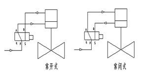 當(dāng)控制器按事先編好的程序?qū)δ硞€(gè)電磁換向閥輸出一個(gè)電信號(hào),該電磁換向閥動(dòng)作,使帶壓儀表氣過(guò)電磁換向閥的切換進(jìn)入氣動(dòng)執(zhí)行機(jī)構(gòu)的氣缸上腔或下腔,推動(dòng)活塞運(yùn)動(dòng)使閥們開啟或關(guān)閉。閥門的工作流向應(yīng)是高進(jìn)低出(如圖所示)。 |