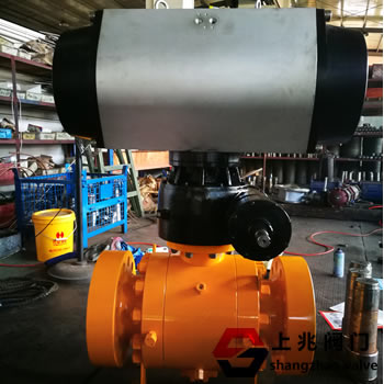 Q647Y 氣動固定式硬密封耐磨球閥是由固定球閥與GT、AT、AW等系列單、雙作用氣動執(zhí)行器兩部分組成,其球體采用上、下兩根閥桿固定,工作時,流體壓力不會使球體向閥座移動,閥座不會承受過大壓力而變形,閥桿部分設(shè)有自潤滑軸承,減少磨擦,開關(guān)扭距小,兩閥座均采用彈簧設(shè)預(yù)緊,密封采用聚四氟乙烯鑲?cè)脘撊?nèi),鋼圈后部設(shè)有彈簧,保證閥座緊貼球體,當(dāng)閥門中腔壓力異常升高超過彈簧頂緊力, 緊急切斷閥閥座后退脫離球體,達(dá)到自動泄壓效果,壓后閥座自動復(fù)位。結(jié)構(gòu)的先進(jìn)性使氣動固定球閥的密封性能穩(wěn)定、操作省力,使用壽命長,極適用于長輸管線和般管線。氣動固定球閥在各類管路系統(tǒng)中用于截斷或接通介質(zhì)流通,使介質(zhì)按照預(yù)定的程序輸送到各個點,特別適用于高壓、大口徑的場合。