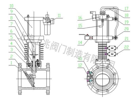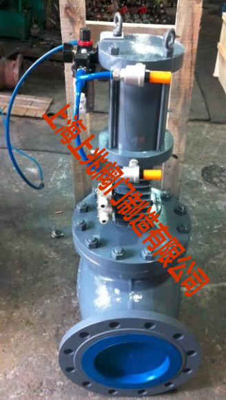 1.該氣動(dòng)抽氣止回閥采用獨(dú)立的逆止閥和輔助氣動(dòng)關(guān)閉裝置相結(jié)合的結(jié)構(gòu)型式(氣源用戶自備),當(dāng)汽輪機(jī)開始工作時(shí),控制系統(tǒng)裝置中的氣源通過電磁換向閥進(jìn)入助關(guān)氣缸的下腔,推動(dòng)助關(guān)氣缸活塞向上移動(dòng),壓縮彈簧并使彈簧蓄能,閥板在管路介質(zhì)的推動(dòng)下開啟。當(dāng)系統(tǒng)故障時(shí),管路介質(zhì)壓力降底,閥板在自身重力的作用下關(guān)閉,此時(shí)控制系統(tǒng)供氣電磁換向閥接受信號(hào)氣源換向,使氣體進(jìn)入助關(guān)氣缸的上腔,與彈簧一起推動(dòng)氣缸活塞向下移動(dòng),幫助閥板以最快的速度關(guān)閉,閥門在閥板關(guān)閉后從輔助動(dòng)力裝置獲得一定鎖閉閥板力,以防管路系統(tǒng)蒸汽和冷嶷水倒流,保護(hù)汽輪機(jī)等主要設(shè)備。 2.閥門執(zhí)行機(jī)構(gòu)采用氣開式,一旦電磁換向閥接受信號(hào)氣源換向,執(zhí)行機(jī)構(gòu)彈簧和電磁換向閥氣源能使閥門迅速關(guān)閉,關(guān)閉時(shí)間0.5~1秒。