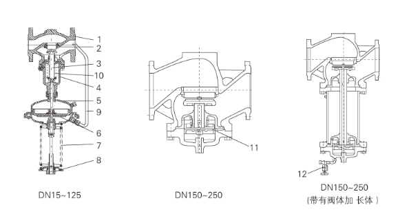 | 結(jié)構(gòu)簡(jiǎn)圖 | | 1 | 2 | 3 | 4 | 5 | 6 | 7 | 8 | 9 | 10 | 11 | 12 | | 閥體 | 閥座 | 閥軸 | 閥蓋 | 膜蓋 | 膜片 | 彈簧 | 調(diào)節(jié)螺母 | 導(dǎo)壓管 | 波紋管 | 平衡膜片 | 充注閥 |